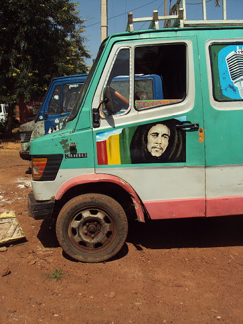 this is a sotrama. (so-tram-a) and it is how we all get around here in mali. they pile as many people as possible inside and off we chug along. it's an interesting way to travel, and sometimes you don't get as far as you want before you break down, but it works. (i made sure to take up a chose picture of bob marley, he is kinda big here, thought you'd enjoy that)